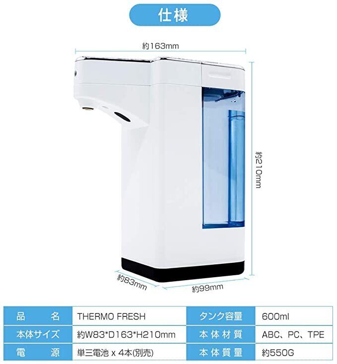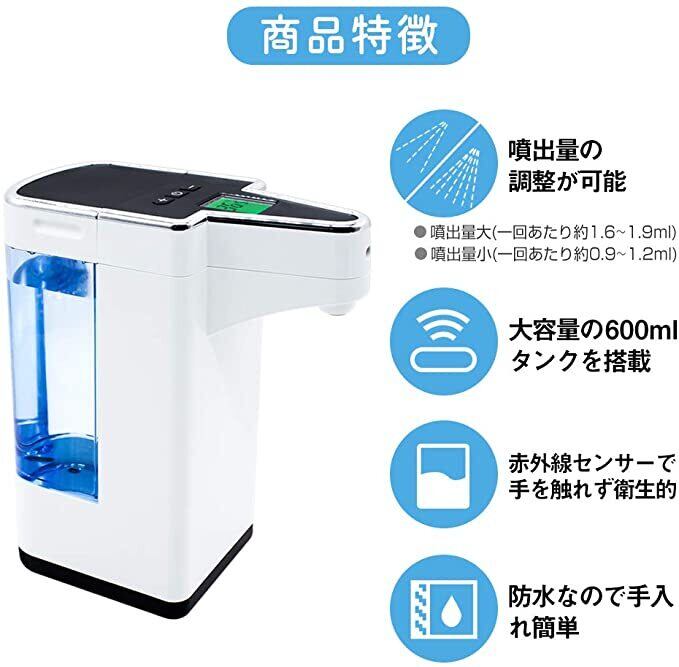 【最新の設計】①本商品のタンクは600mlです。ほぼ市販の同類品の2倍です。頻繁的に液をいれる必要はありません。②敏感の赤外線のセンサーはついおりますので、手が感知エリアにいれると、定量の液が出ます。③個人差があるので、吐出定量が2段階調整できます。④底部には新しい滑り止めゴム四点がつき、簡単に倒せません。本体の材質はABSなので、固くて壊れにくいです。⑤商品は防水仕様なので、洗面所などのところに置いても安心です。ただし、商品は完全に防水ではないので、電池をいれる部分に水を入れないようにご注意ください。
