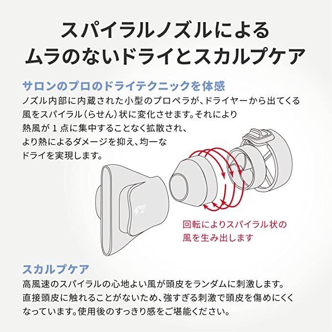 ✅【均一ドライ&スカルプケア】スパイラルノズルから出るらせん状の風が熱の一点集中を防ぎムラのないドライを可能にしました。またランダムな風により頭皮をやわらかく刺激します。